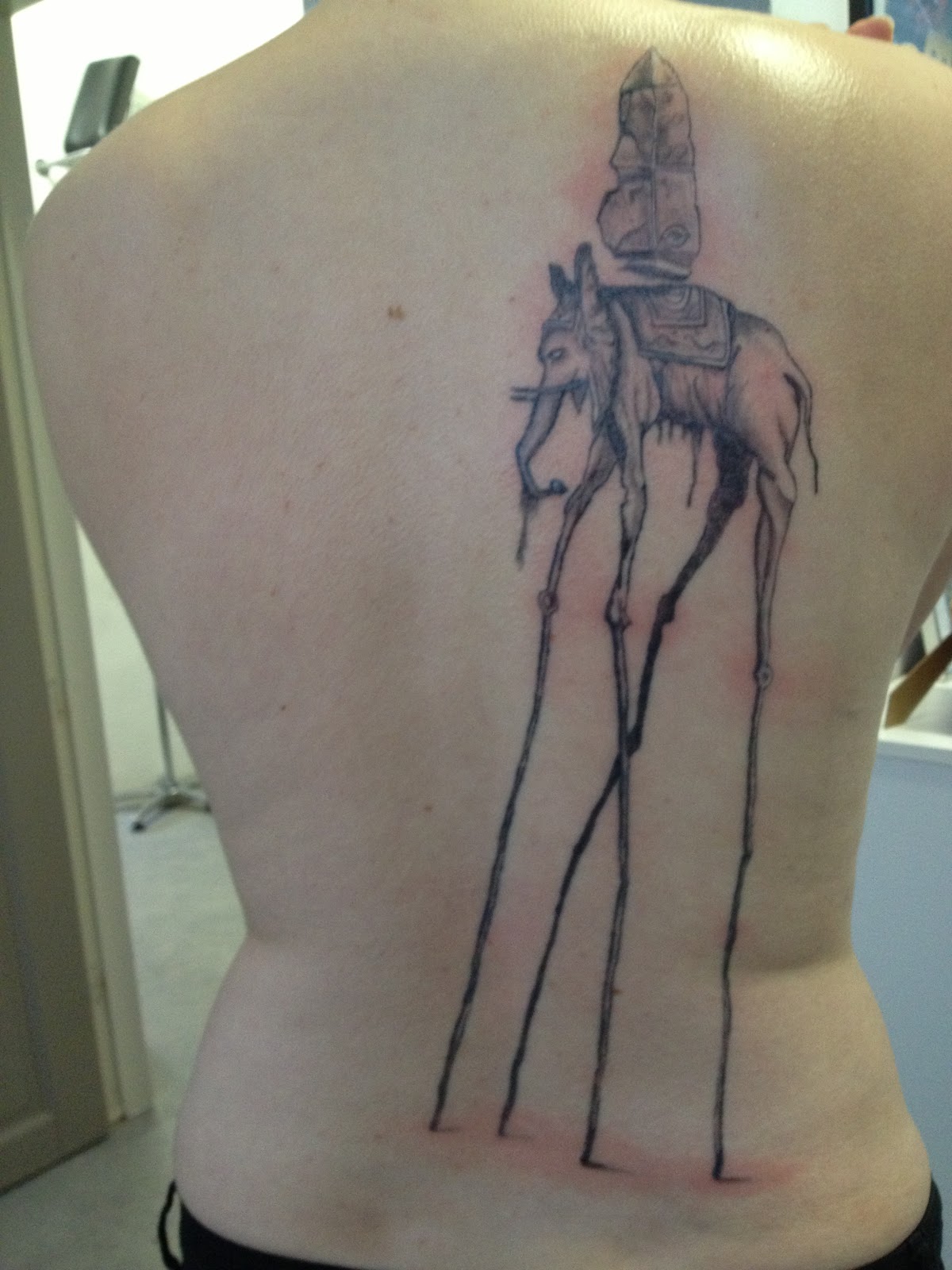 Wanneer je tattoo gezet is, dan spreken we na vier weken nog een keer af. Gewoon om even te kijken of 't goed is. Of om een mooie foto te maken. Dit valt onder de garantie en er zijn verder geen kosten aan verbonden. Bij deze tattoo twijfelde ik nog over de schaduw aan de onderkant, dan is het goed om even te wachten en te kijken hoe het na vier weken valt. De dali olifant is nu klaar, met highlights en schaduw.
