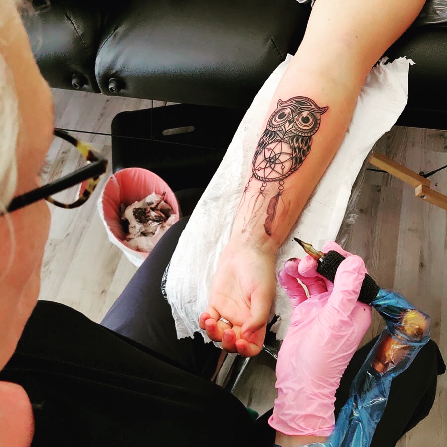 Op de onderarm van Levi zitten een aantal littekens. Levi wil hier graag een tattoo overheen. Niet zozeer om het te ‘verstoppen, maar meer om het af te sluiten. Zelf heeft Levi een ontwerp van een uil met dromenvanger gevonden. Deze hebben we natuurlijk wat veranderd naar eigen wens en aangepast voor op de arm.
