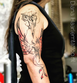 De Phoenix van Jakke is helemaal op maat gemaakt voor haar arm. Het lijfje is opgebouwd uit lijn werk. De vleugels zijn wat grover, Haida beïnvloed. Hier zit rood in verwerkt. De tattoo Simon delen gezet. Op de foto is nog niet alles genezen.