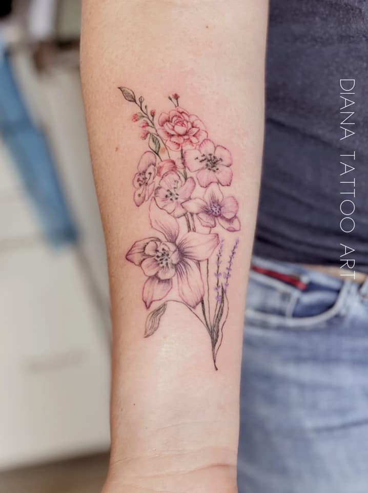 Deze fine line Tattoo pronkt op de onderarm van Tamara. Zij kwam in de shop met de vraag; “ik wil graag iets met lavendel en een andere bloem in kleur op mijn onderarm. Samen hebben we deze compositie gemaakt. De bloemen zijn geboortebloemen van haar kinderen en klein de lavendel erbij. De verschillende stijlen waarin dit gezet kan worden hebben we besproken en fineline sprak Tamara het meeste aan.